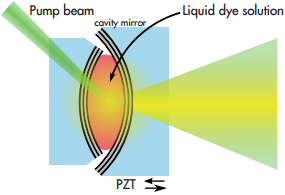 通常情況下,我們使用溶解在甲醇或者乙二醇(均可作為熱浴或者粒子庫)中的羅丹明6G染料。微腔截止能量(反射鏡間距)由PZT主動控制。