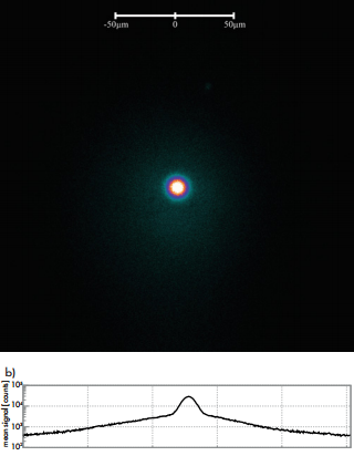 圖2: a) 微腔發(fā)光圖片?;#ò咨┋B加于熱光子云之上。所示圖片拍攝時EM增益設為250,以用足像素的滿阱容量。 b) 水平方向分布。數(shù)據(jù)具備足夠的信噪比和可忽略的噪聲本底,清晰展現(xiàn)了熱光子云和高度布居凝聚模式的雙模疊加分布。