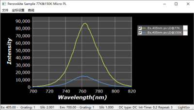 激發(fā)源:405nm ps激光二極管,產(chǎn)生主峰在760nm左右的發(fā)射峰。其中在77K溫度下主峰是763nm,86000信號(hào)強(qiáng)度,在150K溫度下主峰是761nm,15000信號(hào)強(qiáng)度。溫度從77K到150K,峰位藍(lán)移了2nm,并且信號(hào)降低了。
