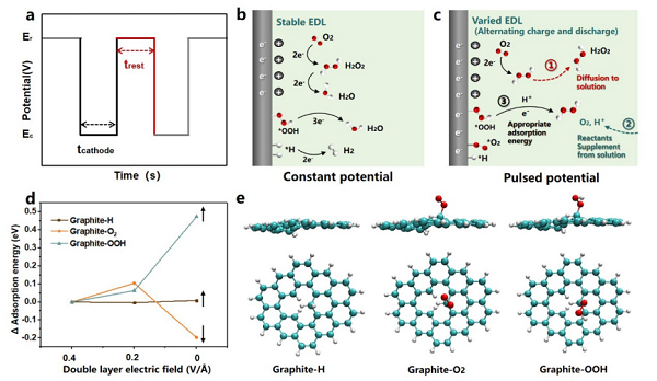 (a)脈沖電催化中的tcathode and trest;(b)、(c) 恒電位電催化和脈沖電位電催化之間的反應(yīng)路徑存在差異;(d) EDL電場強(qiáng)度變化對ORR中間體吸附能的影響;(e) 具有固有缺陷的石墨烯的中間體(*H/*O2/*OOH)吸附模型。