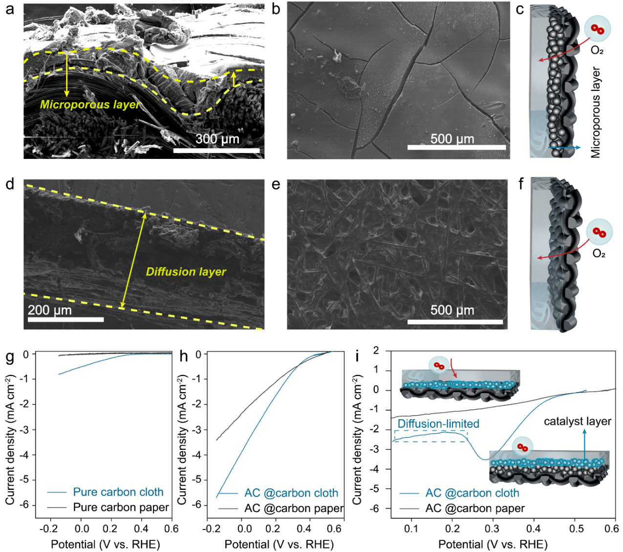 實(shí)驗(yàn)利用氣體擴(kuò)散電極(GDE)探討微環(huán)境對(duì)H2O2合成特性的影響。研究表明使用碳布基底相對(duì)于碳紙同樣具有更優(yōu)的法拉第效率和H2O2合成特性。相較于只具有擴(kuò)散層的碳紙,碳布微孔層的存在會(huì)輔助構(gòu)建反應(yīng)物聚集的界面環(huán)境進(jìn)而強(qiáng)化反應(yīng)動(dòng)力學(xué);在GDE和IME測(cè)試體系中AC@carbon cloth相比于AC@ carbon paper 更優(yōu)的動(dòng)力學(xué)活性證實(shí)了這一觀點(diǎn)。