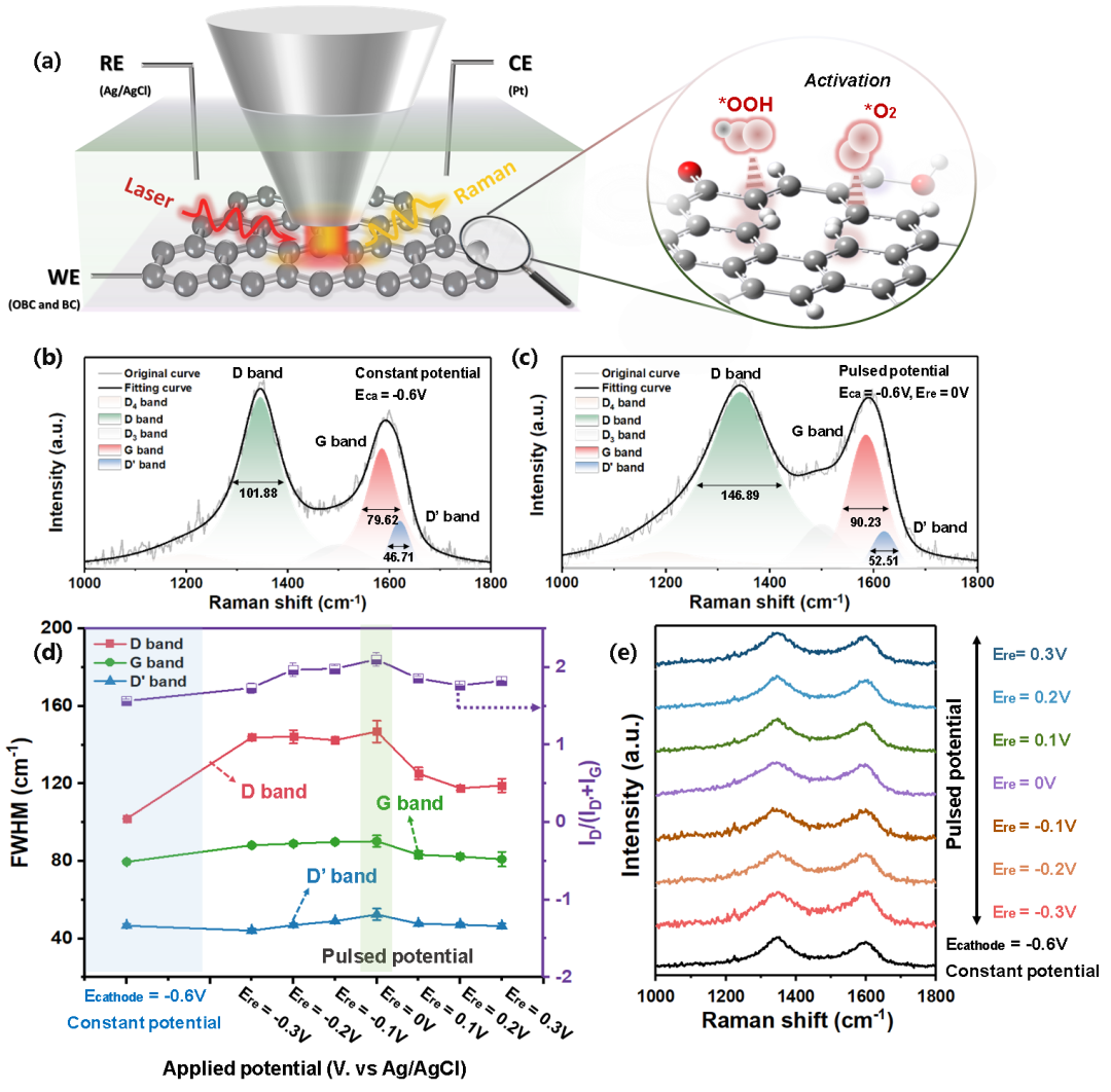 (a)原位拉曼表征原理;(b-c)在恒電位電催化(b)和脈沖電位電催化條件下(c)的D帶、G帶和G’帶的反卷積原位拉曼光譜;(d-e)恒電位和不同脈沖電位Erest下的半高寬、ID/(IG+ID’)比(d)和相應(yīng)的拉曼光譜(e)。
