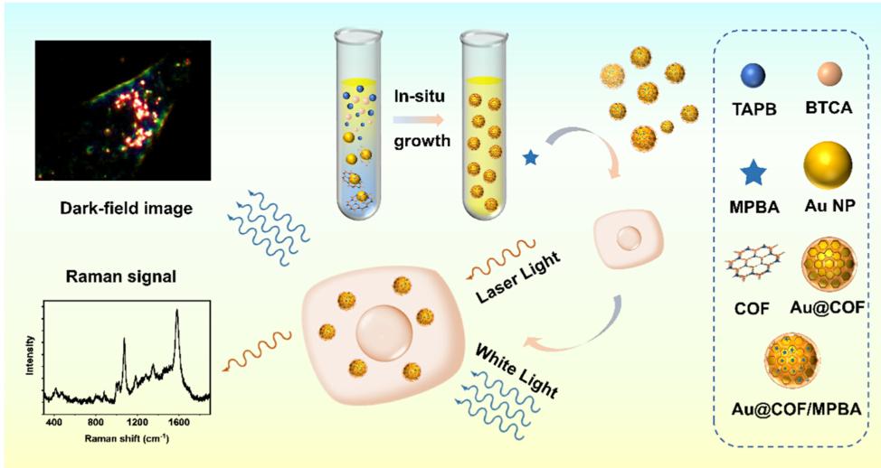 南京師范大學(xué)王琛教授課題組在Au納米粒子上覆蓋二維共價有機(jī)框架(COFs)構(gòu)建尺寸可控、富集力強(qiáng)、穩(wěn)定性高和生物相容性更好的核殼結(jié)構(gòu)(Au@COF)生物傳感器。并用拉曼光譜/暗場散射成像雙模技術(shù)實時監(jiān)測活細(xì)胞中過氧化氫代謝物水平。實驗結(jié)果證明,該生物納米傳感器簡單、高效,可實現(xiàn)過氧化氫和細(xì)胞代謝產(chǎn)物的在線檢測。本研究為開發(fā)基于COF的SERS生物傳感平臺提供了實驗思路,為細(xì)胞代謝產(chǎn)物相關(guān)疾病早期診斷提供一種有效方法。