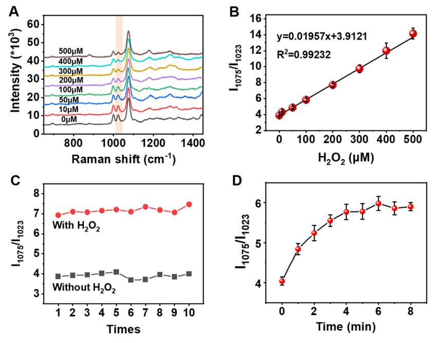 圖3 (A) 不同H2O2濃度下, B-O-H變形振動的1023 cm−1拉曼峰;(B)I1075/I1023拉曼峰強(qiáng)度比與H2O2濃度函數(shù)關(guān)系(C)I1075/I1023拉曼峰強(qiáng)度比率與時間變化關(guān)系,Au@COF為0.5nM