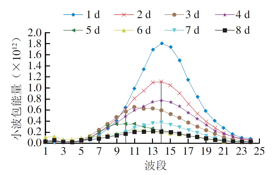 圖2 不同貯藏日特征激發(fā)波長下發(fā)射光譜波段對(duì)應(yīng)的小波包能量變化曲線(劃分尺度12 nm)