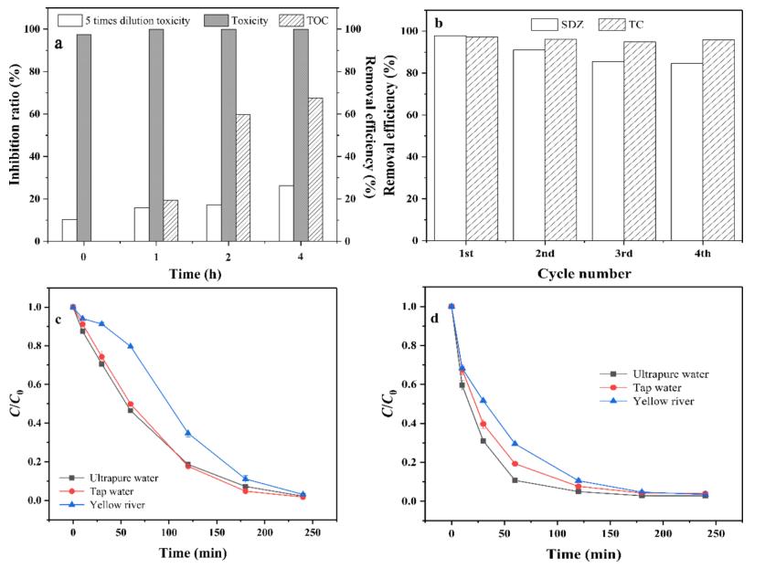 圖6 (a) SC/PS體系中TOC和毒性的變化;(b) SC活化PS催化降解SDZ和TC的可重復(fù)利用性;實際廢水中(c) SDZ和(d) TC的降解效率