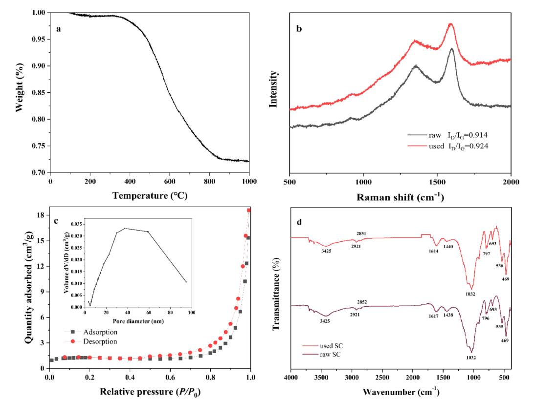 圖3 SC的(a) TG圖,(b)拉曼光譜,(c) N2吸附-解吸等溫線與孔徑分布曲線(插圖)以及(d) FT-IR光譜