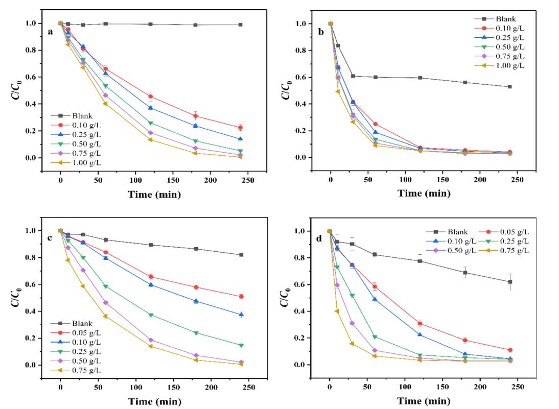圖4 PS (a, b) 和SC (c, d) 用量對 (a, c) SDZ和 (b, d) TC降解效率的影響