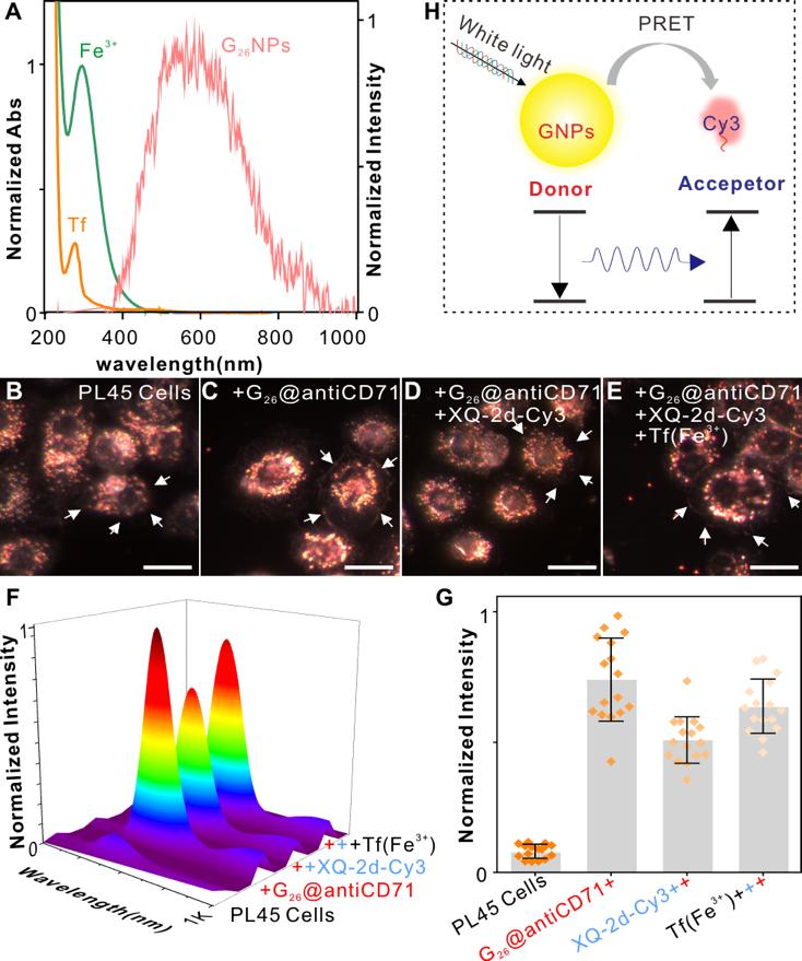 轉(zhuǎn)鐵蛋白Tf與適體XQ-2d-Cy3之間的競爭性結(jié)合,抑制了適體的結(jié)合,使得活細(xì)胞膜表面降低的金顆粒散射信號有所恢復(fù),進一步驗證了PRET能量轉(zhuǎn)移過程的發(fā)生,展現(xiàn)了該PRET納米尺測量分子分離距離、蛋白質(zhì)互作、分子靶標(biāo)識別等方面的可行性。