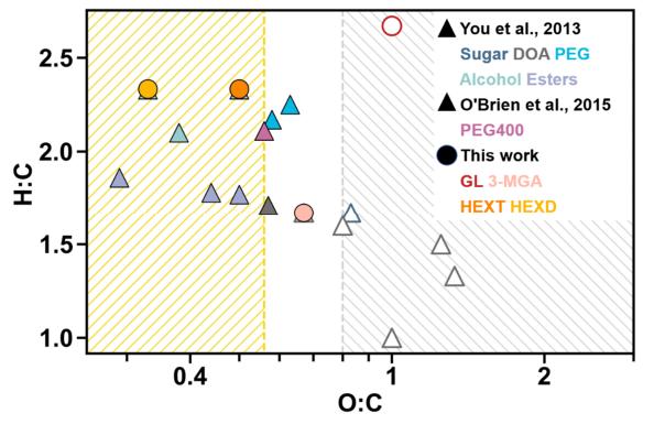 圖5. 混合有機(jī)/硫酸銨(AS)顆粒的Van Krevelen圖:實(shí)心符號表示觀察到了液-液相分離(LLPS),而空心符號表示未觀察到液-液相分離。實(shí)心三角形代表二元羧酸(DOA,包括丙二酸、蘋果酸、檸檬酸、戊二酸和二乙基丙二酸),糖類(如脫水葡萄糖),酯類(包括己二酸二乙酯、癸酸甲酯和聚丙烯酸酯),醇類(包括2,5-己二醇、丙二醇和1,2,6-己三醇),聚乙二醇(包括PEG200和PEG300)數(shù)據(jù)引自于You等人的工作(2013年),硫酸銨-聚乙二醇400的合成方法引自于O'Brien等人的工作(2015年)。