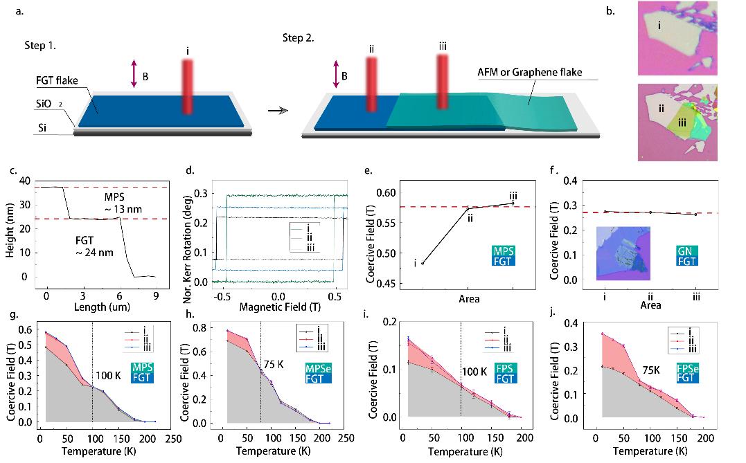 第一部分的探索性實(shí)驗(yàn)如上圖所示分為兩個(gè)階段。第一階段,首先對(duì)厚度約24 nm的FGT薄片進(jìn)行磁性表征;第二階段向FGT上方轉(zhuǎn)移一層約13 nm厚度的MPS(MnPS3),并再次測(cè)試被MPS覆蓋和未覆蓋區(qū)域的磁性。結(jié)果表明,覆蓋了MPS之后,覆蓋和未覆蓋區(qū)域的磁性均受到了相同程度的調(diào)制。