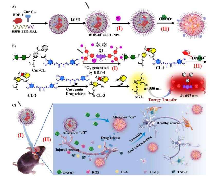 圖.(A)BDP-4/Cur-CL NP的制造、藥物釋放和近紅外余輝發(fā)光的示意圖。(B)分子結(jié)構(gòu)轉(zhuǎn)換協(xié)議。(C)用于IS的BDP-4/Cur-CL NPs示意圖。