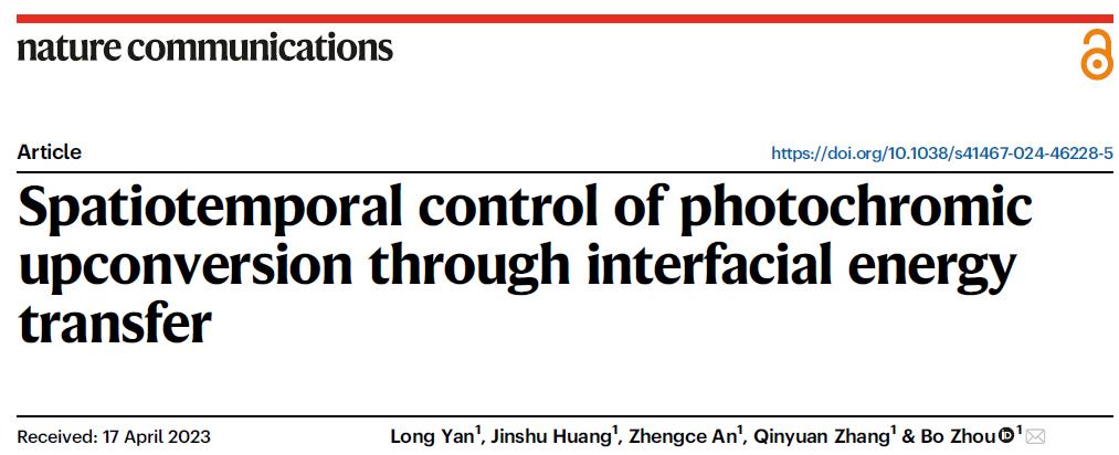 針對(duì)上述科學(xué)問(wèn)題,華南理工大學(xué)發(fā)光材料與器件國(guó)家重點(diǎn)實(shí)驗(yàn)室周博教授團(tuán)隊(duì)提出了一種基于界面能量傳遞(IET)的概念模型,在時(shí)間和空間維度上實(shí)現(xiàn)了上轉(zhuǎn)換發(fā)光動(dòng)力學(xué)過(guò)程調(diào)控與光色動(dòng)態(tài)調(diào)節(jié)。該工作以“Spatiotemporal control of photochromic upconversion through interfacial energy transfer”為題發(fā)表在著名期刊Nature Communications上。