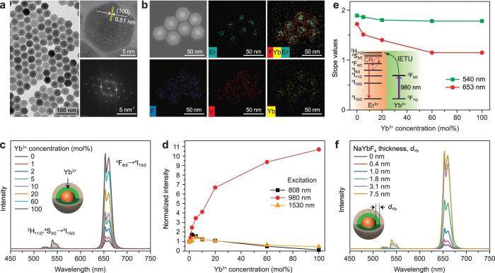 圖2. 樣品形貌及光譜表征。a,b)樣品的TEM圖及元素分布;c,d)變Yb濃度樣品的上轉(zhuǎn)換光譜及不同波長(zhǎng)激發(fā)的發(fā)射強(qiáng)度變化;e)功率-強(qiáng)度雙對(duì)數(shù)曲線斜率;f)不同敏化層厚度樣品的上轉(zhuǎn)換光譜。