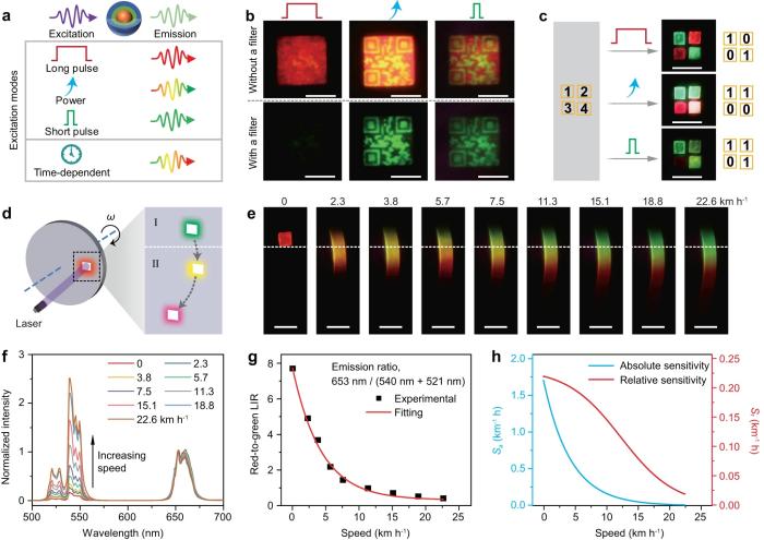 圖5. 前沿應(yīng)用。a)發(fā)光顏色多模調(diào)制;b)高泵浦功率或短脈沖激發(fā)解碼圖案信息;c)多維光信號(hào)的快速識(shí)別。d,e)速度監(jiān)測(cè)示意圖及結(jié)果;f-h)光譜結(jié)果分析及靈敏度變化。