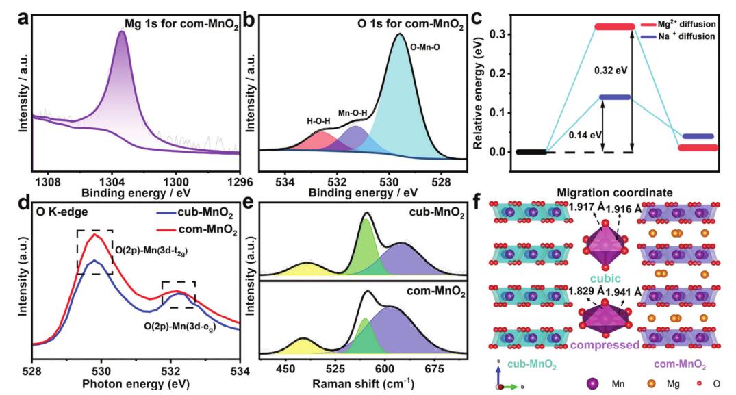 圖2. XSP圖(a,b);遷移能(c); cub-MnO2he com-MnO2拉曼光譜圖(e)層結(jié)構(gòu)