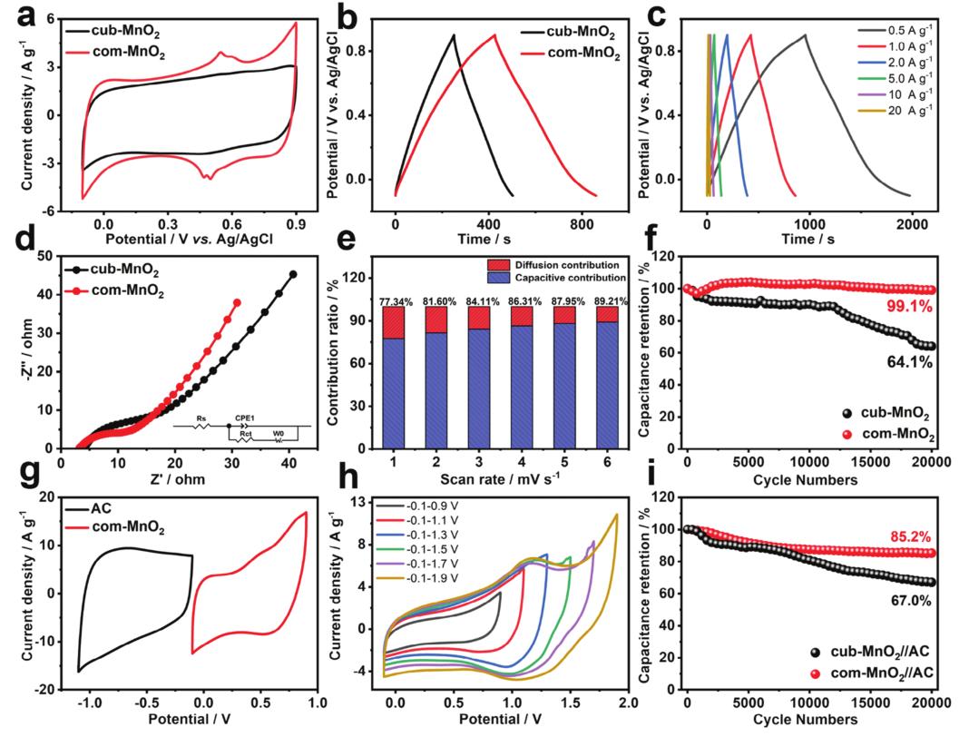 com-MnO2具有提升的循環(huán)穩(wěn)定性,其99.1%的容量保留率(圖3f),優(yōu)于cub-MnO2的64.1%,表明com-MnO2伴隨壓縮的[MnO6]增強(qiáng)了可逆Na+存儲(chǔ)性能。
