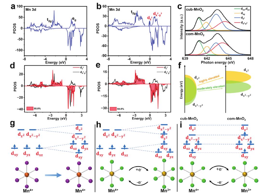 拉曼光譜(圖2e)闡明了[MnO6]八面體的具體變化。兩個(gè)樣品都有三個(gè)以481.1、573.6和624.5 cm−1為中心的峰。624.5 cm−1處的峰表現(xiàn)出明顯的紅移,而570.8 cm−1處的峰表現(xiàn)出較小的波數(shù)波動(dòng)。這兩個(gè)峰的變化表明在[MnO6]八面體中Mn─O鍵沿軸向收縮,這證實(shí)了在com-MnO2中壓縮[MnO6]八面體的特征。此外,還使用DFT計(jì)算模擬了晶體結(jié)構(gòu),如圖2f所示。結(jié)果表明,cub-MnO2在不同方向上的Mn─O鍵長(zhǎng)相同,均為1.916 Å。而com-MnO2的平均Mn─O鍵長(zhǎng)在軸向?yàn)?.829 Å,在其他赤道面為1.941 Å,與拉曼結(jié)果吻合較好。