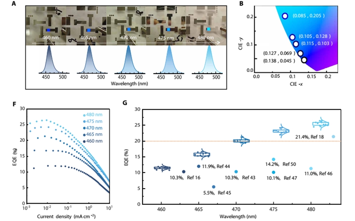 團(tuán)隊(duì)基于含銣納米晶制備的鈣鈦礦藍(lán)光LED器件在顯示需要的波段下均實(shí)現(xiàn)了更高的器件效率,特別是480 nm的器件效率達(dá)到了26.4%,是截止目前鈣鈦礦藍(lán)光LED器件中的*高效率。