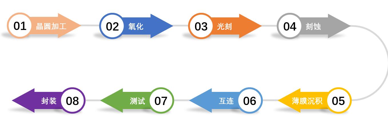 半導(dǎo)體產(chǎn)品的制造需要數(shù)百個工藝,通常來講,整個制造過程分為八個步驟:晶圓加工-氧化-光刻-刻蝕-薄膜沉積-互連-測試-封裝。