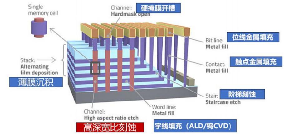 要形成多層的半導(dǎo)體結(jié)構(gòu),需要先制造器件疊層,即在晶圓表面交替堆疊多層薄金屬(導(dǎo)電)膜和介電(絕緣)膜,之后再通過重復(fù)刻蝕工藝去除多余部分并形成三維結(jié)構(gòu)??捎糜诔练e過程的技術(shù)包括化學(xué)氣相沉積 (CVD)、原子層沉積 (ALD) 和物理氣相沉積 (PVD),采用這些技術(shù)的方法又可以分為干法和濕法沉積兩種。