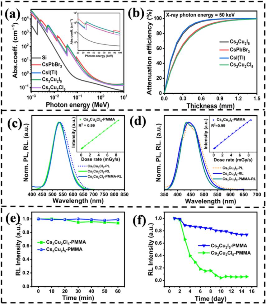 圖2. (a) Cs3Cu2Cl5、Cs3Cu2I5、CsPbBr3、硅(Si)和CsI(Tl)的吸收系數(shù)曲線與光子能量的關(guān)系。(b) Cs3Cu2Cl5、Cs3Cu2I5、CsPbBr3和CsI(Tl)在50 keV X射線下的衰減效率;(c) Cs3Cu2Cl5和(d) Cs3Cu2I5的光致發(fā)光(PL)光譜、放射光致發(fā)光(RL)光譜。(e) 連續(xù)X射線輻照的穩(wěn)定性。(f) 暴露于空氣后的穩(wěn)定性。