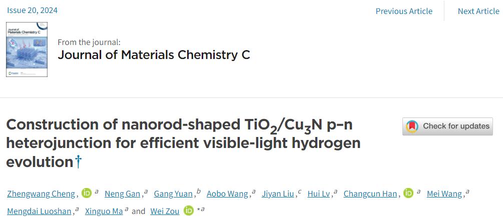 針對上述科學(xué)問題,湖北工業(yè)大學(xué)理學(xué)院(芯片產(chǎn)業(yè)學(xué)院)程正旺等提出了一種基于匹配帶隙和功函數(shù)的p-n異質(zhì)結(jié),不僅促進(jìn)了可見光吸收,還極大地提高了光生載流子的分離與遷移效率,實現(xiàn)了高效、穩(wěn)定的PEC可見光析氫。該工作以“Construction of nanorod-shaped TiO2/Cu3N p–n heterojunction for efficient visible-light hydrogen evolution”為題發(fā)表在國際期刊Journal of Materials Chemistry C上。