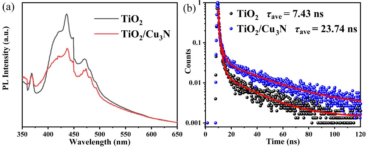 程正旺等采用磁控濺射法,將p型Cu3N薄膜沉積到一維 n型TiO2納米陣列上,形成了TiO2/Cu3N p-n異質(zhì)結(jié)。得益于合適的能隙和內(nèi)建電場的協(xié)同作用,形成的TiO2/Cu3N p-n異質(zhì)結(jié)不僅將帶隙從TiO2的3.09 eV減小到TiO2/Cu3N的2.01 eV,光響應(yīng)范圍也從從紫外區(qū)擴(kuò)展到可見光區(qū)域。此外,光生電子-空穴對的分離和轉(zhuǎn)移效率明顯改善,平均載流子壽命延長了3倍。進(jìn)一步地,在> 420 nm可見光照射和-0.97 V vs. RHE(可逆氫電極)條件下,光電流密度從TiO2的-0.33 mA/cm2提高到TiO2/Cu3N的-4.66 mA/cm2,提高了約14.12倍。此外,構(gòu)建的TiO2/Cu3N異質(zhì)結(jié)表現(xiàn)出穩(wěn)定的PEC析氫性能,相應(yīng)的可見光分解水產(chǎn)氫速率達(dá)到6.98 µmol/cm²/h。以上結(jié)果表明:構(gòu)建具有合適帶隙和功函數(shù)的p-n異質(zhì)結(jié)是提高TiO2光電催化性能的一種有效途徑,并且有望應(yīng)用于其他光電催化劑。本項研究為設(shè)計和制備高效、低成本、無毒的PEC分解水電極和其他光電子化學(xué)應(yīng)用提供了一條有效的途徑。