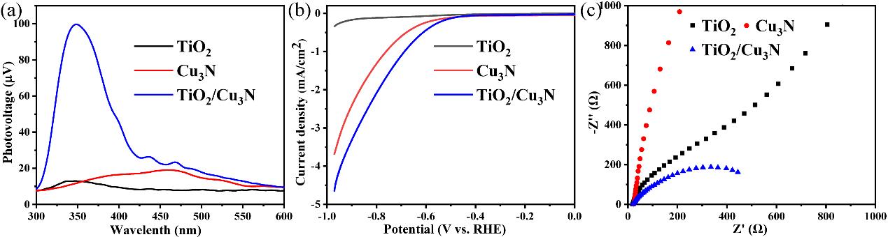 圖6. (a) TiO2、Cu3N及TiO2/Cu3N的表面光電壓譜(SPV);(b) 在-0.97 V vs. RHE和> 420 nm光照射條件下,TiO2、Cu3N及TiO2/Cu3N的光電流密度-電壓曲線;(c) 電化學(xué)阻抗Nyquist圖。