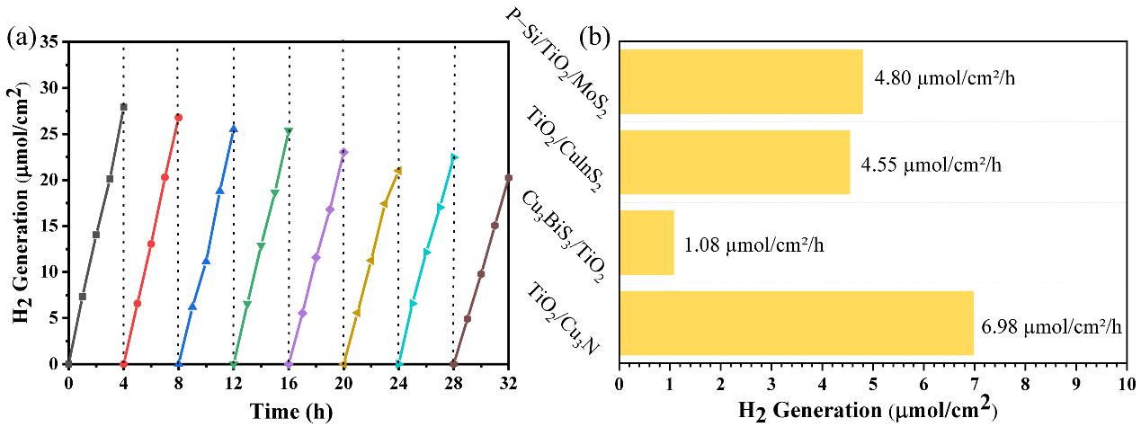 圖7. (a) TiO2/Cu3N在> 420 nm可見光照射下PEC產(chǎn)氫H2的循環(huán)穩(wěn)定性。(b)本研究中TiO2/Cu3N的平均產(chǎn)氫速率與報道的TiO2基異質(zhì)結(jié)結(jié)果的比較。