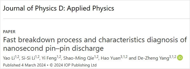 近日,大連理工大學(xué)物理學(xué)院的楊德正教授團(tuán)隊(duì)在納秒火花放電中的超快擊穿過程的研究中取得新進(jìn)展,研究成果以” Fast breakdown process and characteristics diagnosis of nanosecond pin-pin discharge”為題發(fā)表在國(guó)際**期刊“Journal of Physics D: Applied Physics”上。