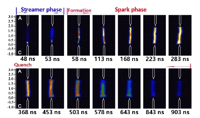 本文系統(tǒng)地研究了大氣壓下單個(gè)納秒脈沖內(nèi)的火花放電擊穿現(xiàn)象,通過聯(lián)合使用條紋相機(jī)與ICCD相機(jī),捕捉到了單脈沖內(nèi)火花放電通道的擊穿及演化過程。同時(shí),利用時(shí)間分辨的光學(xué)發(fā)射光譜(OES)技術(shù)對(duì)放電過程中產(chǎn)生的各活性物種的產(chǎn)生及其淬滅過程進(jìn)行了分析,并對(duì)納秒脈沖火花放電等離子體的氣體溫度以及電子密度等特性進(jìn)行了診斷。