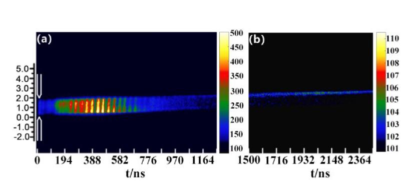 由于初始擊穿過程和流光到火花階段的轉(zhuǎn)換過程通常在幾納秒的時(shí)間尺度內(nèi)完成,ICCD相機(jī)難以捕捉到其中變化,因此需要使用分辨率更高的條紋相機(jī),圖3-4為條紋相機(jī)采集到的火花放電過程圖像,采集的時(shí)間窗口分別設(shè)置為980ns(Δ t=9.8ns)以及10 ns(Δ t=9100 ps)。從圖3中可以發(fā)現(xiàn),在形成放電通道的初期,靠近負(fù)極的放電發(fā)光更強(qiáng)。而在形成放電通道之后,正極附近的放電更強(qiáng)一些。1500ns之后,火花放電通道熄滅,而在負(fù)極附近仍然可以觀察到放電等離子體的余輝。