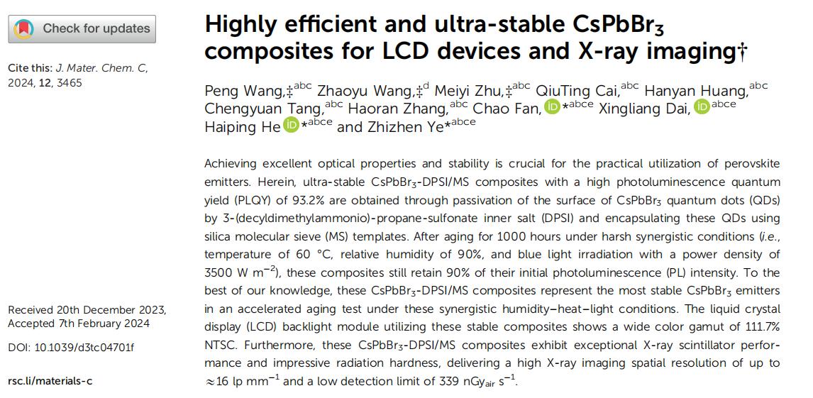 近日,浙江大學(xué)材料學(xué)院葉志鎮(zhèn)院士團(tuán)隊(duì)在高光效、高穩(wěn)定鈣鈦礦復(fù)合結(jié)構(gòu)方面取得重要進(jìn)展,研究成果以“Highly efficient and ultra-stable CsPbBr3 composites for LCD devices and X-ray imaging”為題發(fā)表在國際知名學(xué)術(shù)期刊Journal of Materials Chemistry C (doi:10.1039/d3tc04701f)上。浙江大學(xué)為該論文第一單位,王朋博士、王昭宇博士、朱美怡博士為共同第一作者,葉志鎮(zhèn)院士、何海平教授、樊超博士為共同通訊作者。