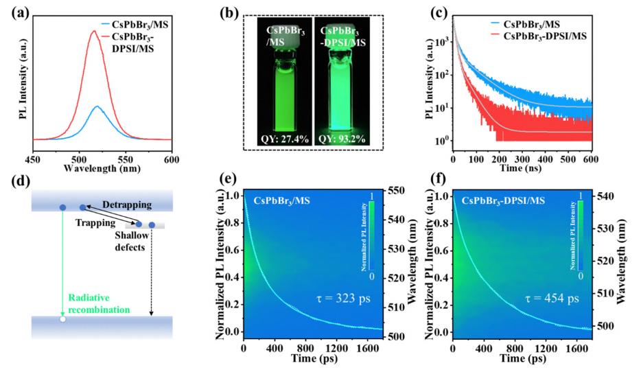 以上圖中可見,CsPbBr3-DPSI/MS復(fù)合材料的熒光量子產(chǎn)率提高到了93.2%。在405nm的飛秒激光激發(fā)下,條紋相機(jī)獲取得到的圖像表明,CsPbBr3-DPSI/MS平均壽命從323ps(鈍化前)增加到454ps,這也證實(shí)了DPSI在鈣鈦礦量子點(diǎn)表面的有效鈍化作用。