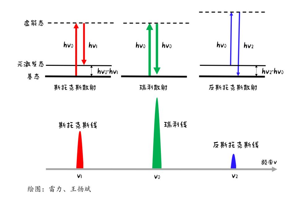 在光與物質(zhì)相互作用過程中,拉曼散射光與入射光的頻率差(拉曼頻移)反映物質(zhì)的固有屬性,可以根據(jù)拉曼頻移的大小來研究物質(zhì)的結(jié)構(gòu)與物性。值得注意的是,拉曼散射現(xiàn)象和熒光現(xiàn)象物理的機(jī)制不同,拉曼效應(yīng)不能用實(shí)際電子能級(jí)躍遷來解釋,而用元激發(fā)的虛能級(jí)躍遷來說明。拉曼散射過程中,如果散射光子的能量小于入射光子的能量(hv1<hv0),稱之為斯托克斯散射;如果散射光子的能量大于入射光子的能量(hv1>hv0),稱之為反斯托克斯散射。在一次常規(guī)的拉曼散射物理過程中,正、反斯托克斯散射會(huì)同時(shí)發(fā)生,由于基態(tài)和激發(fā)態(tài)的相對(duì)熱占比遵循玻爾茲曼分布,室溫條件下正斯托克斯譜線的強(qiáng)度要高于反斯托克斯譜線的強(qiáng)度(Is>Ias),在實(shí)驗(yàn)上可以通過測(cè)量正、反斯托克斯散射譜線強(qiáng)度比來推測(cè)物質(zhì)的溫度。
