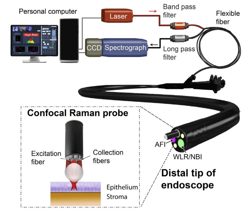 案例1:巴雷特食管是食管腺癌的前兆,早期識別異型增生等高危病變對于提高患者生存率至關(guān)重要。用于診斷BE異型增生的傳統(tǒng)內(nèi)窺鏡檢查受到診斷準確性差和需要大量活檢取樣的限制,導(dǎo)致高昂的醫(yī)療成本和患者負擔(dān)。在新加坡進行的研究涉及從373名具有不同組織學(xué)亞型的上消化道患者身上獲取體內(nèi)組織拉曼光譜,從而構(gòu)建了一個用于診斷BE異型增生的綜合拉曼庫,該系統(tǒng)允許在內(nèi)窺鏡檢查期間進行實時、無創(chuàng)或微創(chuàng)光學(xué)活檢,以更高的精度針對高風(fēng)險組織區(qū)域[]。