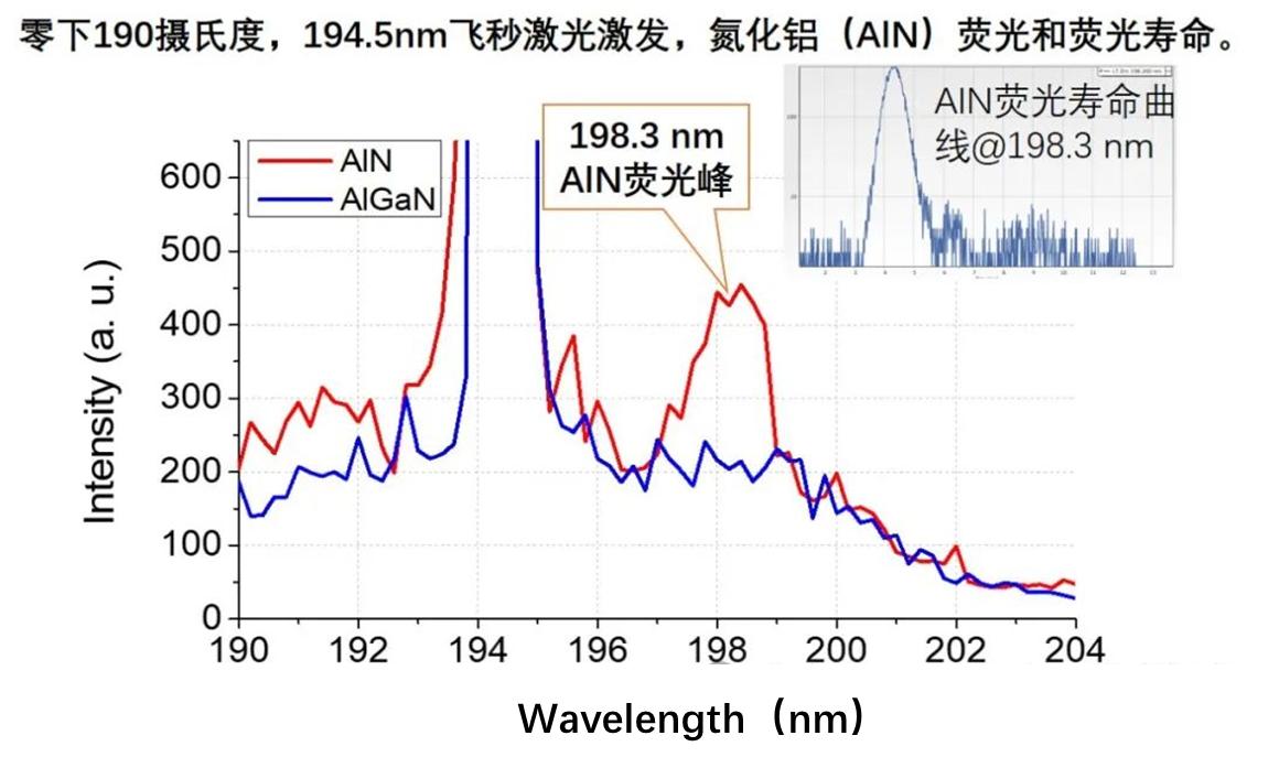 圖1 紅線和藍(lán)線分別是在 -190℃ 的溫度下在同一樣品臺(tái)上和同等條件下AlN樣品和作為對(duì)比樣品的Al0.7Ga0.3N的深紫外光致發(fā)光譜。內(nèi)插圖為AlN在198.3 nm發(fā)光峰的熒光壽命曲線。