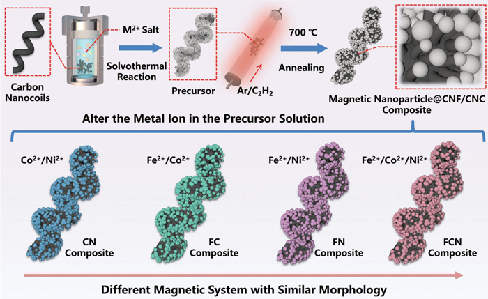 圖一:CN, FC, FN和FCN復(fù)合材料的合成過程示意圖。