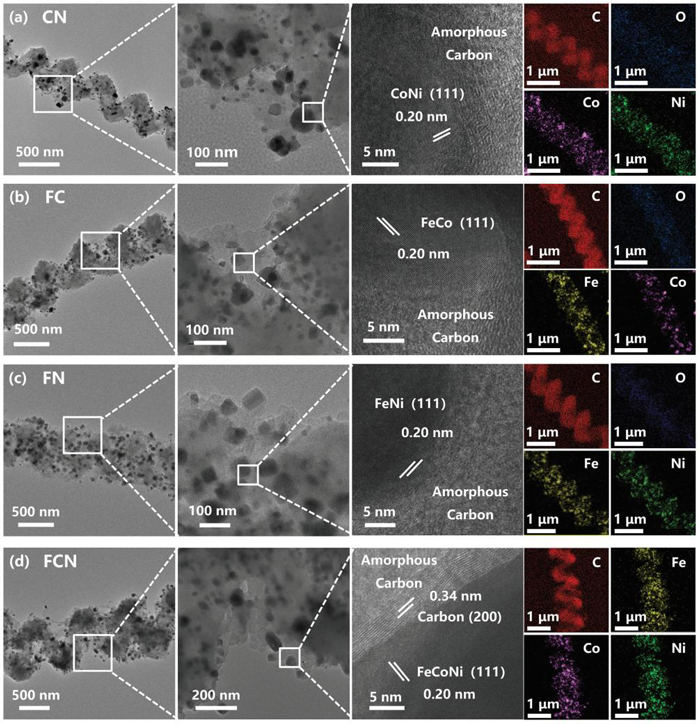 圖三: CN, FC, FN, FCN復(fù)合材料的TEM圖像。