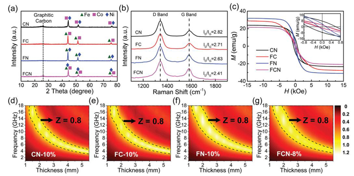 圖四:a) XRD譜圖,b)拉曼光譜,c) CN、FC、FN和FCN復(fù)合材料的室溫磁滯回線;d) CN, e) FC, f) FN, g) FCN復(fù)合材料阻抗匹配等值線圖。
