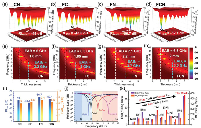 圖五:a、e) CN, b、f) FC, c、g) FN, d、h) FCN復(fù)合材料的三維RL值及其投影圖;i) CN、FC、FN和FCN復(fù)合材料的*小RL值和*大EAB值;j) CN、FC、FN、FCN復(fù)合材料的*小RL曲線;k)*小RLL/填充比和*大EABL/填充比與*近文獻報道的其他碳/磁基吸收劑的比較。