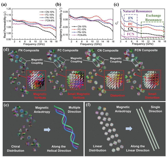 圖七:a)磁導(dǎo)率實部,b)磁導(dǎo)率虛部,c) CN、FC、FN、FCN復(fù)合材料的渦流感應(yīng)系數(shù),d) CN、FC、FN和FCN復(fù)合材料的微磁模擬,e)手性分布模式和f)線性分布模式的微磁仿真。