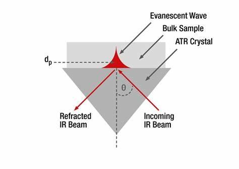由于紅外透射測量需要對樣品進(jìn)行研磨和壓片等繁瑣的前處理,而利用紅外ATR測量可以直接進(jìn)行測量,這大大提高了紅外光譜的測量效率。ATR模式是基于全內(nèi)反射原理,當(dāng)一束紅外光從光密介質(zhì)到光疏介質(zhì),會產(chǎn)生一束反射光和折射光,當(dāng)入射角大于全反射角時,折射光線將沿晶體界面?zhèn)鞑?,引起隱逝波。隱逝波傳播方面沿界面進(jìn)行,等相位面垂直于界面,隨著遠(yuǎn)離界面距離增加,光強(qiáng)逐漸衰減為零,衰減深度為: