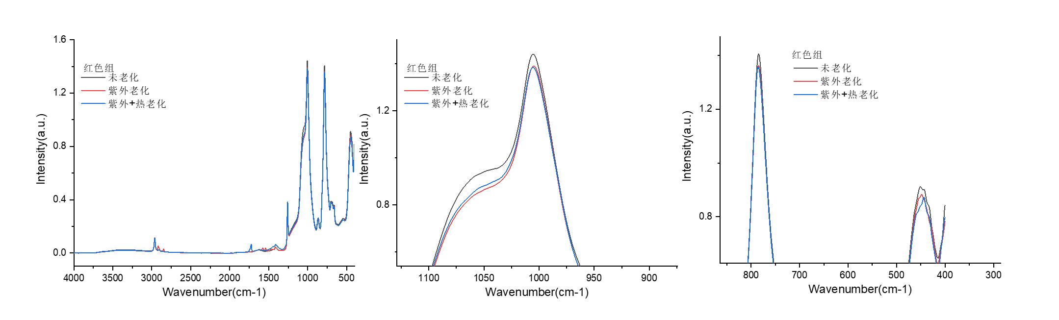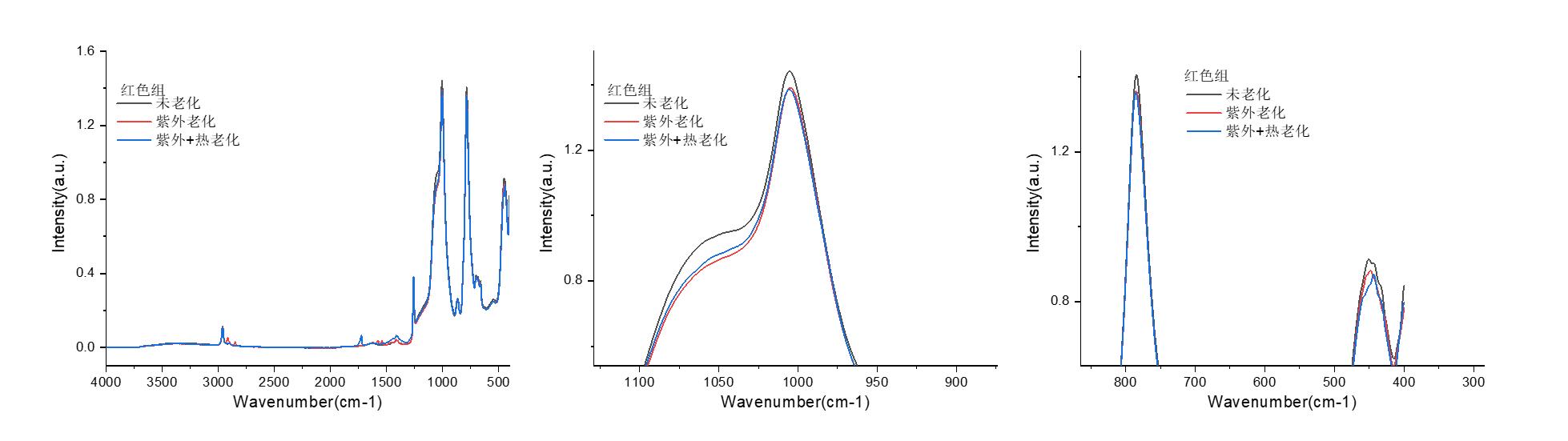 從圖2-4可以看到,通過(guò)紫外光照以及熱處理后, 組樣品老化以后在1258cm-1、1000cm-1以及784cm-1處峰強(qiáng)稍微變?nèi)酰?紅色組樣品在1000cm-1和784cm-1處峰強(qiáng)明顯變?nèi)?;黃色組紅色樣品1000cm-1、784cm-1以及448cm-1處峰強(qiáng)稍微變?nèi)醺黠@。結(jié)果表明在紫光光照下,樣品主鏈Si-0-Si(1000cm-1)和側(cè)鏈Si-C(1258cm-1)有部分發(fā)生斷裂,另外紅色組樣品C-H鍵(3000cm-1)在2850cm-1等處出現(xiàn)新的小峰,說(shuō)明C-H發(fā)生部分氧化,造成醛基等新的化學(xué)鍵形成。