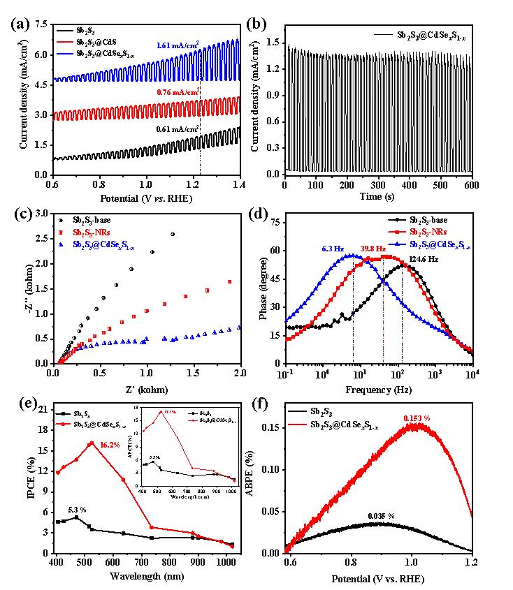 研究結(jié)果表明:本工作采用兩步氣相輸運(yùn)沉積結(jié)合化學(xué)浴沉積和原位硒化策略,在Sb2S3納米棒光電極表面成功構(gòu)建準(zhǔn)一維S型Sb2S3@CdSexS1-x異質(zhì)結(jié),有效抑制了Sb2S3深能級(jí)缺陷導(dǎo)致其光生載流子嚴(yán)重復(fù)合的弊端,實(shí)現(xiàn)光生載流子高效分離。此外原位硒化有助于光電化學(xué)性能與穩(wěn)定性的提升。研究結(jié)果為開發(fā)和設(shè)計(jì)高效穩(wěn)定的Sb2S3基光電器件提供了有效的策略。