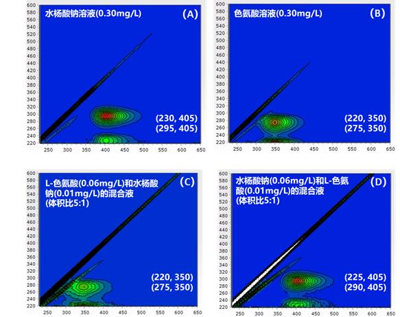 參照HJ1407-2024附錄A配制L-色氨酸溶液、水楊酸鈉溶液及其二者的混合液,使用SmartFluo-Pro進(jìn)行水質(zhì)熒光指紋的識(shí)別,分別測(cè)量0.3 mg/L L-色氨酸溶液、0.3 mg/L 水楊酸鈉溶液、L-色氨酸溶液(0.06 mg/L)和水楊酸鈉溶液(0.01 mg/L)的混合液(體積比5:1)、水楊酸鈉溶液(0.06 mg/L)和L-色氨酸溶液(0.01mg/L)的混合液(體積比5:1)。由于SmartFluo-Pro所配置的陣列檢測(cè)器能實(shí)現(xiàn)快速光譜獲取,因此,每個(gè)樣品三維熒光光譜的測(cè)試時(shí)間僅為3-5分鐘。