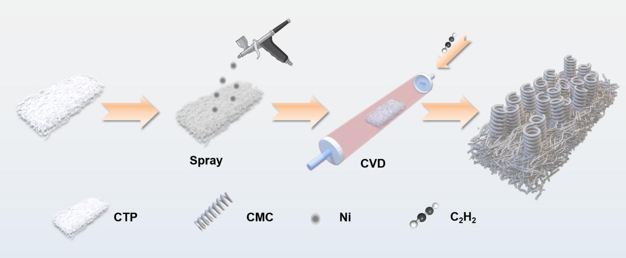 隨著 5-6 代通信技術(shù)的快速發(fā)展,電磁污染問題日益突出,對低成本、寬頻高效的微波吸收材料(MAMs)需求迫切?;谔季€圈(CC)的微波吸收材料(MAMs)因其獨特的3D螺旋形狀、優(yōu)異的分散性和適當(dāng)?shù)膶?dǎo)電性,在微波吸收(MA)領(lǐng)域具有良好的應(yīng)用前景。然而,CC通常生長在平坦和堅硬的基材(如 Al?O?、石英、陶瓷)上上,隨后從基材上刮下。亞穩(wěn)態(tài)的消耗和刮削過程不可避免地增加了制備成本,這限制了CC的大規(guī)模生產(chǎn)和應(yīng)用。碳酸化衛(wèi)生紙(CTP)不僅是一種廉價高效的MAM,而且具有催化劑負載能力,使其適合作為CC生長的基材。同時,CTP和生長的CC可以一起用作MAM,而無需將它們彼此分離。這大大降低了生產(chǎn)成本。