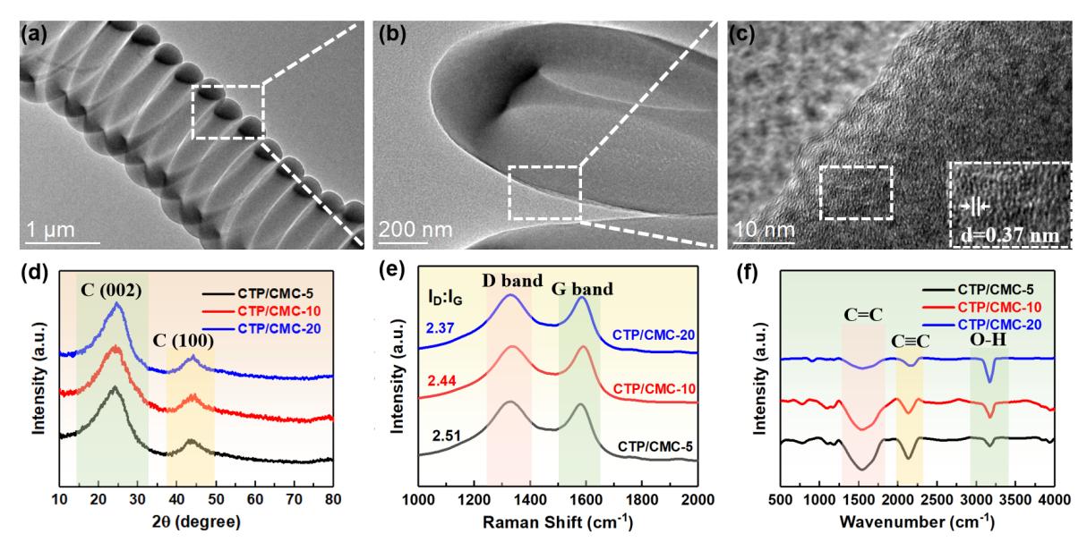 圖3顯示了CTP/CMC-10的TEM圖像,CMC呈現(xiàn)螺旋形態(tài)。CMC內(nèi)的碳呈現(xiàn)出非晶態(tài)多晶結(jié)構(gòu)。碳原子層之間的平均間距為0.37nm。在CMC的XRD中觀察到24.5°和43.0°處的兩個寬峰,分別對應(yīng)于石墨碳的(002)和(100)平面。沒有觀察到Ni的吸收峰,這可能是由于鎳含量低。CTP/CMC-5、CTP/CMC-10和CTP/CMC-20的ID/IG值分別為2.51、2.44和2.37。由于CMC的缺陷水平低于CTP,ID/IG值逐漸降低。CTP/CMC復(fù)合材料的石墨化程度增加。