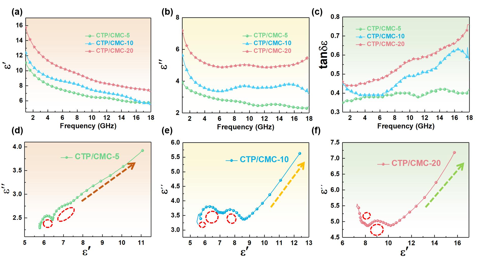 圖4顯示了CTP/CMC的復(fù)介電常數(shù)。CTP/CMC的介電常數(shù)隨著鎳噴涂次數(shù)的增加而逐漸增加。ε^''的逐漸增加表明CMC的生長豐富了導(dǎo)電網(wǎng)絡(luò)。圖4d-f顯示了科爾-科爾半圓。在圖4d中,CTP/CMC-5顯示了兩個半圓,這歸因于螺旋CMC引起的交叉極化和CMC和CTP內(nèi)的多晶無定形碳引起的界面極化。在圖4e中,CTP/CMC-10呈現(xiàn)三個半圓。半圓數(shù)量的增加表明,除了多晶非晶碳之間的交叉極化和交叉極化外,CTP和CMC之間還形成了界面,增加了極化位點,改善了界面極化。在圖4f中,CTP/CMC-20顯示了兩個半圓,與CTP/CMC-10相比,其偏振數(shù)較低。這是由于CMC增長顯著增加,CTP/CMC-20中幾乎完全是CMC,減少了CMC和CTP之間的界面。